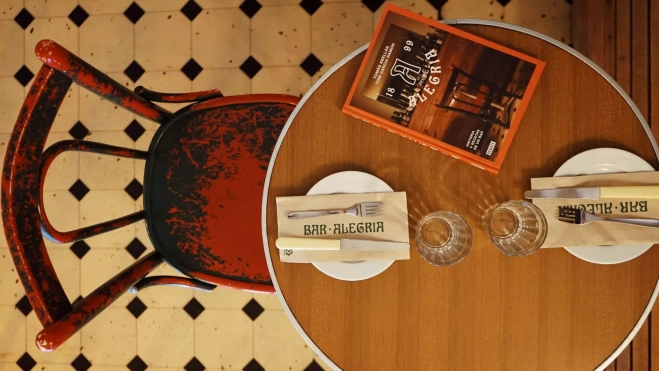 Tomàs Abellan y el periodista Toni Ramón presentan el libro Alegría. Historia y recetas de un bar (Debate) que conmemora los 125 años de historia del emblemático Bar Alegría, un establecimiento barcelonés abierto por la familia Cortés Macià en 1899.