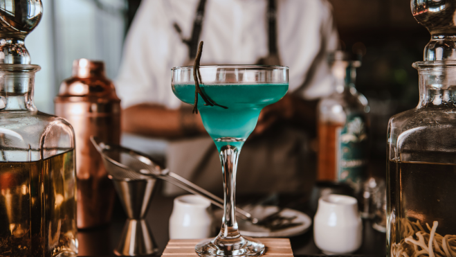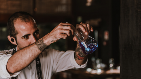 En su pequeño carrito de coctelería, Quesada embruja con movimientos sutiles y eficaces que van creando una amalgama de tonos azules y verdosos. Como si de un buen mago se tratase, la elaboración de sus cócteles bebe de ginebra pura dando tragos con alto contenido alcohólico. En cambio, el toque brusco del etanol no desarma, equilibrando al paladar la mezcla de cítrico, algas y licor de extracto de flor eléctrica. “Tiene un poder analgésico interesante que sorprende a los comensales”, dice.