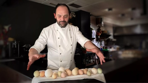 El final del menú es un flan excepcional. Un flan sin fórmula fija que cocina con siete variedades distintas de huevo: de gallina, de pollita, de pato, de avestruz, de oca, de gallina acahuata, incluso cuando los consigue, incorpora huevos de urraca. “Cada uno de ellos tiene un sabor y una textura concreta, y como no tengo siempre los mismos, no tengo una fórmula exacta”.