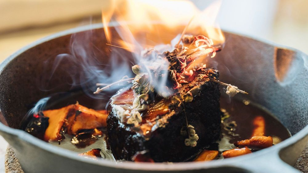 Pan a la parrilla con crema de berenjenas asadas, tomate con tomatada a la brasa, calabacines al rescoldo con pesto de albahaca, navajas a la robata (parrilla japonesa) con salsa verde y rábano picante, camarones a la brasa con pimiento de Espelette, bonito a la brasa, sardinas a la parrilla con pimientos asados, chipirón en ensalada de verduras asadas o brocheta de mollejas de cordero son algunas de sus propuestas.
