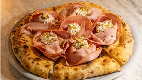 Llama la atención que el amasado sea a mano. Es probable que, en una cata ciega, esa misma masa, resultado de una harina de calidad excepcional, masa madre, agua y sal fermentada de forma natural a temperatura ambiente, no se distinguiera de otra amasada a máquina, del mismo modo que muchos sostienen que una pizza horneada a leña sabe igual que una hecha con gas o en horno eléctrico; al fin y al cabo, los noventa segundos que pasa en el horno no dan tiempo real para que se ahúme.