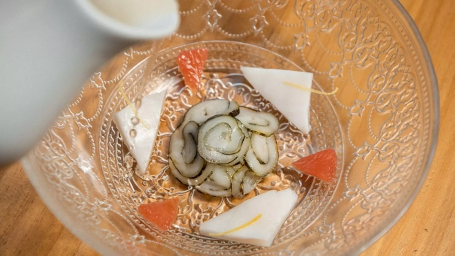 Hasta la que quizás sea la presentación más memorable del menú, el pase de morena y toronja, con los lomos del pescado en salmuera y su piel templada con un consomé ahumado. Un plato visualmente muy pensado, que juega con la geometría y que resulta sutil al paladar, potente y a la vez elegante, como si cada cosa estuviera donde tiene que estar. Hay un juego de ingredientes entre lo agresivo y lo dócil, la bella y la bestia. Una cocina que combina la finura y la sencillez en la presentación para no abrumar al público.