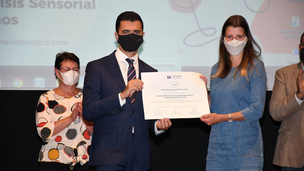 El teatro Príncipe Felipe de Tegueste ha acogido la entrega de los diplomas a las alumnas y alumnos de la sexta edición del Curso de Especialista en Gestión Enoturística y Análisis Sensorial de Vinos de la Universidad de Laguna, que promueven conjuntamente la Cátedra de Agroturismo y Enoturismo de Canarias y la Fundación General de la institución académica.El curso dio comienzo el 21 de octubre del 2019, y su finalización inicialmente prevista para el 27 de marzo, se vio interrumpida en el modo presencial por la crisis sanitaria ocasionada por el COVID-19. De ahí que la Dirección Académica del Curso procediera a la reestructuración de la programación presencial, reformulando y complementando el curso con otras acciones no presenciales que se ajustaron a las recomendaciones derivadas de la situación sanitaria, explicó a los asistentes el director de la Cátedra Carlos Fernández.Fernández felicitó a los más de 240 alumnos y alumnas que se han matriculado en los módulos que conforman el Curso y sus actividades paralelas, que en esta ocasión se han desarrollado en las islas de Tenerife, Lanzarote y La Palma. También agradeció el papel desempeñado por los docentes de esta sexta edición, así como la colaboración de los once consejos reguladores de vinos del archipiélago que participan cada edición en esta oferta formativa.