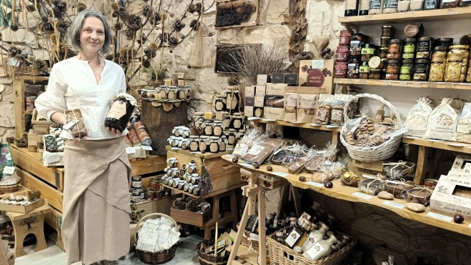 “Tenemos más de 200 referencias distintas”, me cuenta. O lo que es lo mismo: casi cualquier cosa que te puedas imaginar, pero tomando la castaña como ingrediente básico. Hasta los muebles están hechos con madera de castaño. La variedad es inmensa. “Vendo todo tipo de dulces —galletitas, bizcochos, magdalenas, bicas—, licores, patés, mermeladas, harinas o conservas, entre muchas otras cosas. Y por supuesto, marrón glacé y castañas pilongas”, apunta.