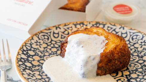 Además, esta torrija croissant se remata con una crema de vainilla de Madagascar. Auténtica, recalcan los responsables de la panadería, mientras recuerdan que el precio de esta cotizada especia anda sobre los 500 euros el kilo. Además de para la crema, la masa laminada con mantequilla también se remoja en leche infusionada con auténticas vainas de vainilla. Un pequeño lujo accesible, porque cada una de estas torrijas cuesta 6,5€. // Pastelerías Mallorca. Disponible en sus tiendas de Madrid y envío a domicilio.