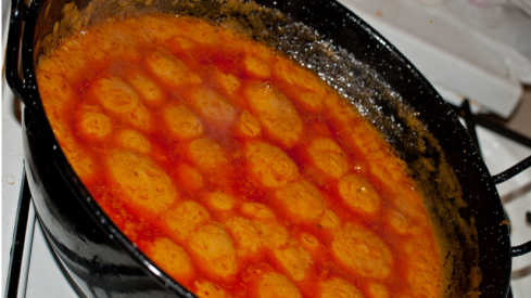 Ingredientes (6 personas): 8 cucharadas grandes de harina de almortas – 300 grs. de panceta fresca – 250 grs. De hígado de cerdo – 150 grs. de setas de cardo – 3 chorizos – 4 dientes de ajo – 1 guindilla roja seca – 1 cucharada sopera de pimentón dulce de la Vera – 120 cl. De aceite de oliva – una pizca de alcaravea -.Elaboración: Salpimentar el hígado y rehogarlo en una cazuela con un poco de aceite. Añadir agua hasta cubrirlo y dejarlo cocer durante 25 minutos aproximadamente, escurrir y apartar.En una sartén alta echar un poco de aceite, saltear las setas troceadas y apartar. Añadir el resto del aceite, freír los chorizos y la panceta troceados y apartar también dejándolo escurrir sobre papel absorbente. Colar el aceite y volver a echar en la sartén, freír los ajos y la guindilla seca y apartar.Con el aceite caliente, pero fuera del fuego, rehogar durante unos segundos el pimentón, añadir la harina y rehogar ya en el fuego, pero con poca llama. Tostar bien la harina con cuidado de que no se queme, pero teniendo en cuenta que no quede cruda (como para una bechamel) y añadir después un litro de agua (la proporción aproximada es de un vaso pequeño de agua por cada cucharada de harina) remover bien para que se mezcle y no queden grumos y dejar cocer.Mientras, habremos puesto en un mortero: dos dientes de ajo, la alcaravea y el hígado troceado con una cucharada de agua, lo machacamos todo hasta que quede una pasta y le añadimos el majado a la sartén donde ya están cocinándose las gachas. Añadimos también las setas y dejamos que las gachas espesen. Cuando veamos que empiezan a hacer volcanes en la superficie, aflorando así la grasa hacia arriba, es el momento de apartarlas.Lo normal es comerlas en la misma sartén mojando trozos de pan de cruz del día anterior (pan sentado), y comiendo la panceta y el chorizo después, aunque en algunas zonas se los ponen encima a las gachas. un plato que, bien elaborado, puede ser sublime, aunque su alto aporte energético, en forma de grasas saturadas e hidratos de carbono, hacen recomendable su degustación muy esporádica, ya que la sedentaria vida moderna no se parece a la de nuestros antepasados.