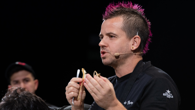 En escena, el mejor chef del mundo por segundo año consecutivo, y una parte muy representativa de su equipo, cuatro cocineros, cada uno de ellos de uno de los conceptos que componen el universo XO: DiverXO, StreetXO, RavioXO y GoXO. Hacía mucho tiempo que Muñoz no se subía a este escenario para cocinar, como él mismo ha reconocido. Y lo ha hecho para presentar cuatro platos que forman parte de la oferta actual de DiverXO, su restaurante de tres estrellas Michelin.