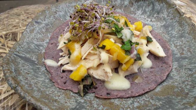 Todo muy colorista, sencillo, rico y sano.Un taco de trigo sarraceno (alforfón) sirve de base para el respeto al producto y vigilar lo de importante que es la nutrición respetuosa con la sostenibilidad medioambiental y ser inclusivos con consumidores que padezcan intolerancias o alergias alimenticias.