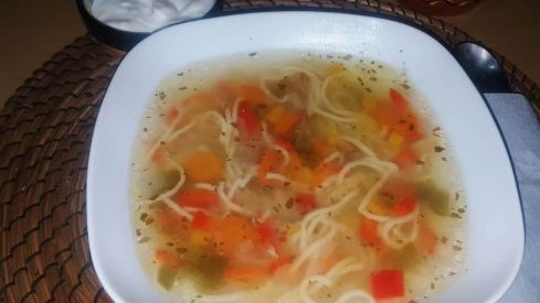Receta proporcionada por Olga Esanu, originaria de Moldavia. Esta sopa es muy tradicional en República de Moldavia y aunque parezca muy sencilla, se hace algo diferente según la zona del país. Pero lo más básico e importante de esta especialidad es que lo da ese toque especial que es el ingrediente llamado borș (un caldo agrio basado en ingredientes como trigo o cebada de salvado, a veces la remolacha azucarera, fermentado en agua) ó también se puede cambiar por limón para darle ese toque agrio a la sopa. Ingredientes para 4 personas: • 1 kg de pollo (si es de corral, mejor) • 3 litros de agua aproximadamente • 1 cebolla • 2 zanahorias • Para los tallarines: harina, 1 huevo y sal • 1 limón • Perejil, eneldo,... • Esto es lo básico que lleva la sopa moldava, pero a mí que me encantan los vegetales y le añado un pimiento rojo, uno verde y uno amarillo. También, al gusto, hay personas que les agrada añadir nata fresca, que es otra opción.  Primero se lava bien el pollo, se pone en la cazuela con el agua y sal a fuego lento. Aquí hay dos opciones: seguir todo el proceso en la misma agua o a los 10 min aprox. de cocción se retira esa agua y se sustituye por otro; esto hace que la sopa salga más limpia. Mientras, la carne se va haciendo, se va retirando la espuma y todas las imperfecciones que puedan salir. Aprovechamos para cortar las legumbres y vamos preparando los tallarines caseros, que es tan fácil como romper el huevo y añadir la harina y un poco de sal (yo le añado un toque de aceite de oliva para poder trabajarlo mejor). Antiguamente se hacía una masa fina redonda se dejaba a secar un poco, se hacía rollito y se cortaba a cuchillo, hoy en día con las máquinas que tenemos es mucho más fácil. Una vez el pollo está listo, se le va añadiendo los vegetales, a los 5 min se le añade los tallarines, que no tardarán mucho en hacerse, por lo que al rato se le añade el jugo del limón exprimido. Se deja todos unos 5 min más y antes de apagar el fuego se le pone por ultimo las especies. Que lo disfruten. Olga Esanu