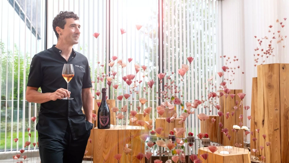 Precisamente hemos viajado hasta Azurmendi para hablar de champán. Y es que el chef vasco se ha aliado con Dom Pérignon para crear un comedor exclusivo en el que se sirve el menú maridado con varias referencias de esta mítica Maison de Champagne, seguramente la más reconocida del mundo y que desde hace años busca tejer lazos con la alta gastronomía. En España ya lo hizo con Quique Dacosta, y ahora es el turno de Atxa.