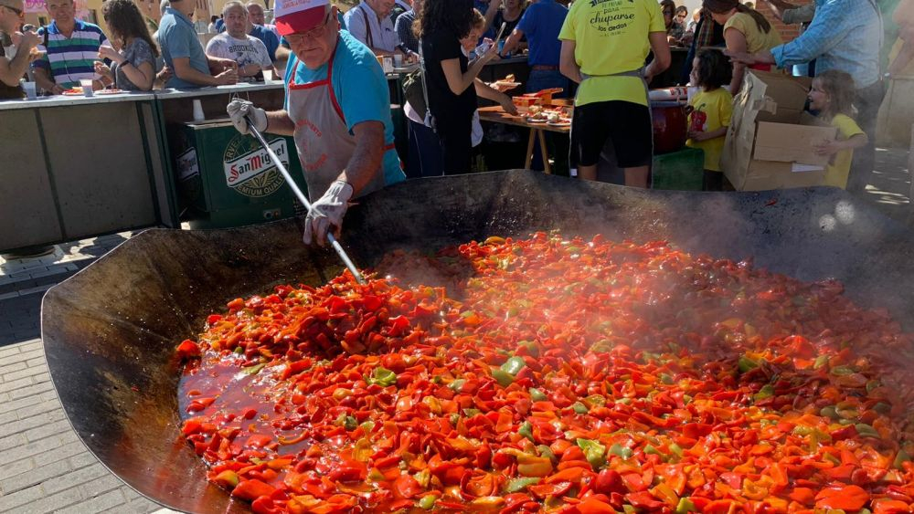 gran pimentada, en gigantescos sartenes, en la plaza del pueblo, donde se preparaban miles de kilos de pimientos, para todos los asistentes poder