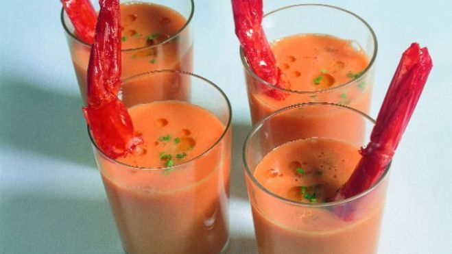 Juan Mari Arzak nos propone una variante a la tradicional receta del gazpacho. Está refrescante y apetitosa receta forma parte de la carta del afamado chef vasco en su Restaurante Arzak.Ingredientes. Para el gazpacho: 3 tomates, 350 g de sandía, medio diente de ajo picado, 5 cucharadas de aceite de oliva, 2 cucharaditas de azúcar, medio calabacín, medio pepino, unas hojas de albahaca, una cucharada de mostaza, dos cucharadas de vinagre de jerez, agua, sal. Para las gambas maceradas y fritas: 12 gambas o gambones frescos, una cucharada de yogur natural, una cucharada de aceite de sésamo, una cucharadita de chutney de mango, aceite para freír, sal de Maldon. Para el pan crujiente: 80 g de pan, un diente de ajo, perejil picado, unas hojas de albahaca picada.Elaboración:Gazpacho. Pon en el horno a 100º durante una hora y tres cuartos los tomates con el ajo y la albahaca picados y una cucharada de aceite. Transcurrido ese tiempo, se saca del horno, se pelan y se trocean. Coloca la pulpa de estos tomates en un bol, añade el calabacín y el pepino picados, agregando también el vinagre, la mostaza, el resto del aceite y el azúcar, cubriendo con agua fría. Pela y despepita la sandía, pícala y añádela a la preparación anterior. Deja en reposo y en un sitio frío durante 10 minutos. Después tritura y cuela, añadiendo más agua fría si es preciso y dándole el punto de sal.Gambas maceradas y frita. Pela las gambas dejando únicamente sin pelar la punta de la cola. Macéralas en el aceite de sésamo, el yogur y el chutney durante una hora como mínimo. Pon una sartén a fuego vivo con el aceite y fríelas, añadiendo al final, al sacarlas del fuego, la sal de Maldon.Pan crujiente. Corta el pan, que previamente habremos frotado con el ajo, en rodajas muy finas, y si no se puede, en taquitos. Pon al horno a baja temperatura hasta que esté desecado y crujiente. Espolvorea con el perejil.Final y presentación. Sirve el gazpacho en unos vasitos o copas. Introduce el pan crujiente y las gambas con la punta de la cola sin pelar hacia arriba. Espolvorea por encima con un poco de albahaca picada.Si no encuentras...Albahaca, usa perejil. Vinagre de jerez, se puede emplear cualquier tipo de vinagre. Aceite de sésamo, puedes utilizar aceite de girasol. Chutney de mango, prescinde de él. Sal de Maldon, usa sal comúnConsejo:Resulta muy agradable añadir en un gazpacho, del tipo que sea, un granizado o un sorbete de alguna fruta o de alguna vinagreta suave o incluso de un vino.Aunque el ajo resulte algo muy propio de los gazpachos, su uso debe moderarse mucho, pues es un arma de doble filo, que lo mismo realza un plato que lo puede estropear por su poder abrasivo.En el caso de que rechace el sabor del ajo crudo, puede confitar esta liliácea, que sin perder su gusto modera mucho su agresiva potencia.Tenga en cuenta al hacer un gazpacho en el que intervengan frutas, sobre todo las muy acuosas, como el melón, uvas, fresas y sobre todo la sandía, que el aporte de agua al gazpacho debe ser menor. En el caso de quedar muy aguado, puede incrementar el punto de pan para darle una textura más densa.Un pequeño truco para sustituir, hasta cierto punto, un auténtico chutney consiste en mezclar una buena mermelada de fruta, no muy dulce, con una cucharada de vinagre de calidad. Así conseguimos el punto agridulce que nos puede interesar.