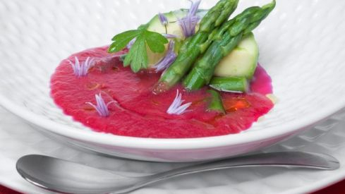 Receta de sopa fría de tomate con sandía y remolacha. Para acompañar el gazpacho unos espárragos cocidos y aguacate.Ingredientes: 6 tomates maduros, 1 rodaja gruesa de sandía, 2 remolachas cocidas, 1 pepino, 1 pimiento verde, 1 pimiento rojo, 1 cebolla, 2 aguacates, 12 espárragos verdes, 50 g de miga de pan del día anterior, vinagre de Jérez, 2 cucharadas de aceite de oliva, sal, cristales de sal, flores para decorar.Elaboración:Limpia y trocea los pimientos rojo y verde y ponlos en un bol. Agrega los tomates, la remolacha, la cebolla y el pan troceados. Pela y trocea el pepino y la sandía y añádelos al bol. Vierte un chorrito de vinagre y una pizca de sal y mezcla bien. Cubre el bol con plástico de cocina y déjalo reposar en el frigorífico durante media hora como mínimo.Transcurrido ese tiempo, retira el plástico, tritura y añade una cucharada de aceite de oliva mientras sigues triturando. Reserva.Cuece los espárragos en un cazo con un poco de agua y sal durante 5 minutos. Escurre y reserva. Trocea los espárragos y los aguacates.Coloca en el fondo de un plato hondo los espárragos, el aguacate, unos cristales de sal y unas flores (opcional). Riega todo con una gotita de aceite de oliva. Lleva el plato a la mesa y sirve el gazpacho en el último momento.Otra variante de gazpacho con sandía: gazpacho de sandía con gambas maceradas fritas y pan crujienteFuente: hogarmania.es