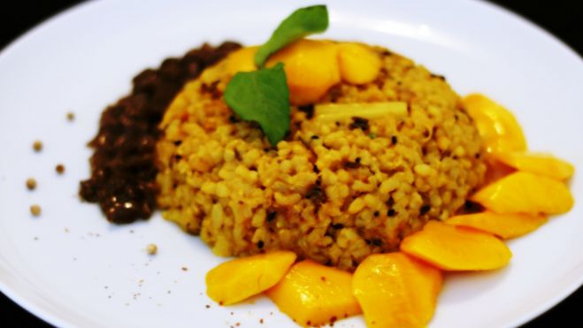 La cocinera Shaila Chulani traspasa fronteras hacia formidables sensaciones gastronómicas y equilibrios con elementos coquinarios como ya desarrolló en su artículo inaugural basado en el concepto 'gaman'. Esta vez nos deleita con 'Petricor', momento 'tierra': arroz integral con granos de soja, especiado con semillas de cebolla, mango fresco y cebolla confitada al comino. 'Petricor' -explica Shaila- "es el término que hace referencia al olor que produce la lluvia al caer sobre suelos secos". Huele a lluvia, desde dentro, a tierra mojada. Todos necesitamos un momento “tierra”. Quiero decir, ese momento del día en el que el pecho necesita llenarse de aire fresco, que la brisa te acaricie la mejilla, poner los pies desnudos en el suelo, la arena, meter las manos en la tierra y sentirla húmeda y llena de vida… El olor a hierba recién cortada, el sentimiento de los ojos de un felino mirándote a los ojos y el calor de un sol que no deja de dorar tu piel mientras tu caminas bajo algún árbol con fruta fresca. Naturaleza, y los cinco sentidos al 100%, ese gaman que nos llevan al centro de la tierra y nos recuerdan cómo cuidarnos y cómo querernos. En esencia, colores cálidos y una fusión de todo eso que nos llega al corazón, en sabores y presencia, comer con las manos y disfrutar al máximo de cada textura y cada razón: arroz integral con granos de soja, especiado con semillas de cebolla, mango fresco y cebolla confitada al comino. Comenzando con cebolla, ajo y puerro en el fondo, algo de grasa y muchísimo cariño, y es que la base es siempre lo más importante para conectar y lograr nuestro objetivo. Un toque de cúrcuma al gusto (foto bajo este párrafo), igual que con el curry, la cayena y el pimentón, aunque es seguro que estos dos últimos brillarán más en menores cantidades. Hora de añadir el arroz integral junto con la soja, todo crudo, y remover con energía, mojar y agregar las semillas de cilantro, y así, terminar la cocción con mimo, para lograr ese meloso que en ocasiones nos hace falta. Cual paleta de colores bronces encontramos otra cebolla, que un principio fue un lienzo en blanco y hemos teñido con comino en polvo y la mitad de sabor panela. Y aquí, y como dice la canción: