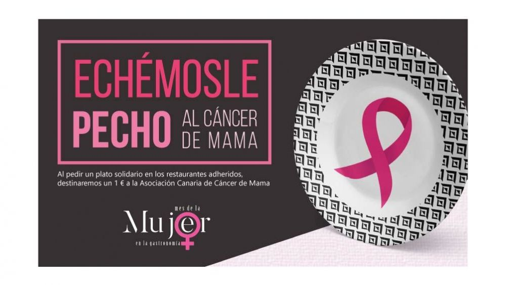 Desde la Asociación Cielo Mar & Tierra y por tercer año consecutivo, celebramos ‘Septiembre, mes de la Mujer en la Gastronomía’, un proyecto conjunto entre la Consejería de Agricultura, Ganadería, Pesca y Aguas del Gobierno de Canarias y la Asociación Cielo Mar & Tierra, que nace para unir fuerzas profesionales, magnificar su voz colectiva y destacar el papel relevante, pero no siempre visibilizado, de las mujeres en este mundo dinámico y diverso de la gastronomía. Con una acción solidaria desde hace samanas contra el cáncer de mama y, para ello, hemos diseñado el proyecto denominado ‘Echémosle pecho al Cáncer de Mama’. Para esta iniciativa los establecimientos que se han adherido, han incluido en su carta un plato solidario (puede ser de nueva creación o una propuesta ya existente, un entrante, un postre…) y cada vez que un comensal lo solicite, el local dona 1€ a la Asociación del Cáncer de Mama de Canarias. Ya contamos con medio centenar restaurantes, dentro y fuera de Canarias que apoyan el proyecto. La campaña se extenderá hasta el 19 de octubre, día internacional contra el cáncer de mama. Desde la Asociación Cielo Mar & Tierra se llevará la campaña de comunicación, junto con los medios asociados y externos, para impulsar la participación de los clientes en la misma y se entregará a cada restaurante, carteles de sobremesa plegados con la imagen de la campaña y un espacio en blanco para la descripción del plato. Tras su culminación, se les dejará el contacto directo de la Asociación del Cáncer de Mama para que realicen el donativo de lo recaudado si intermediarios.