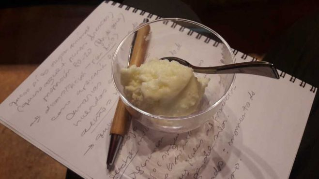 Fernando Sáenz se puso a la labor en el escenario con una proporción de 80-20 de agua-flor de guía: enseñó los pasos a los presentes de este tipo de helado “salado” (término que, afirma, que no le acaba de convencer). Así el especialista heladero montó un helado de queso de cabra y oveja evolucionado más un punto de mojo (el que captura la imagen de portada de atlanticohoy.com) que dio a probar y qué deleitó a los presentes. Soberbio.“Siempre se tiene en cuenta aquellos elementos que expresen la singularidad gastronómica de un lugar, del terruño, bien es verdad que también siendo muy fieles al trabajo del productor, del artesano, manteniendo al máximo la pureza del sabor original”, afirmó.