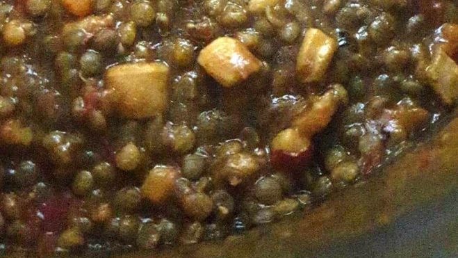 Ingredientes.Lentejas de LanzaroteChipironesPotaCebolleta 2 unidAjo 2 dientespimiento verde1 unidVino blanco 1 chorritoFumet o caldo de pescadoPimentón dulce ahumado 2 cucharaditasTomate frito 2 cucharaditasElaboración. En primer lugar sofreímos la cebolleta en brunoise con el pimiento verde. A medio pochar incorporamos el ajo picado, los chipirones y la pota en trocitos.Una vez todo fondeado incorporamos 2 cucharaditas de pimentón dulce ahumado (de la vera si puede ser) y rehogar un poco e inmediatamente incorporar chorro de vino blanco.Una vez evaporado el alcohol , incorporar 2 cucharadas de tomate frito y el caldo de pescado hasta cubrirlas y un poco más. Rectificar punto de sal y dejar cocer a fuego lento.Aday Estévez explica el origen de la inspiración para esta receta. "Viene de una receta de mi abuela, la cual tengo el recuerdo desde muy pequeño, en el que realizaba las lenteja a base de verduras (la que podía comprar) y al terminarla nos desmigajaba el pescado sobrante el día anterior . Con suerte alguna vez tocaba bacalao o un trocito de pescado salado lo cual era una delicia, y no faltaba el chorrito de vinagre macho que andaba por casa de nuestra finca. Un plato que recordaré siempre".Aday Estévez Lentejas de Lanzarote estofadas, de mar (Aday Estévez)