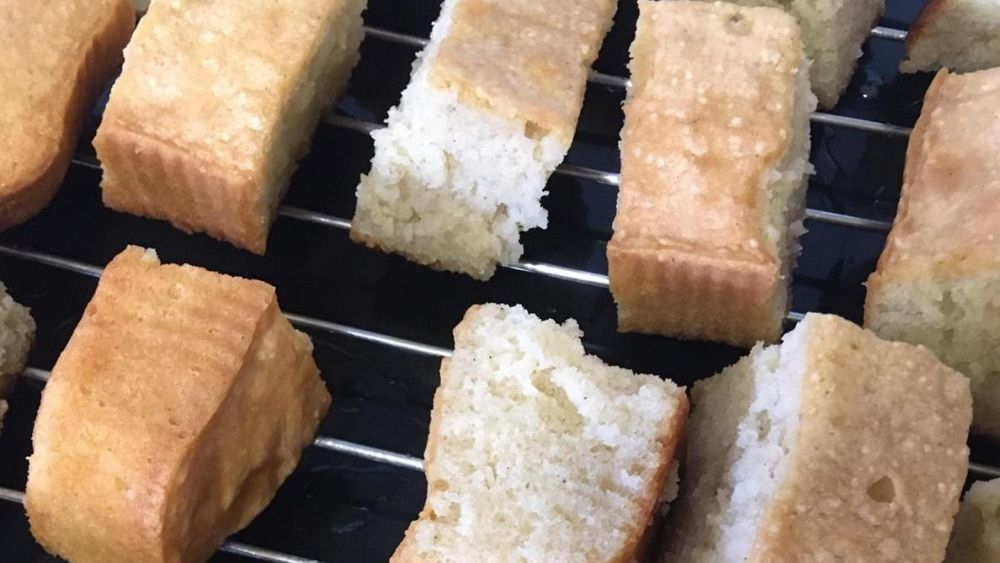 Cuando el bizcochon esté frío, cortarlo en rectángulos de 8x5 cm. Y meter trocito a trocito en el almíbar y ponerlo a escurrir en una rejilla.
