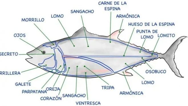 15 piezas diferenciadas de un atún (según el tamaño del ejemplar), cada una con sus propiedades nutricionales definitorias.