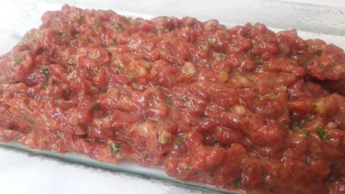 Yo me considero asiduo de este plato, es una de las tantas manías que tengo. Me gusta comparar la forma de hacerlo en los distintos restaurantes. El mejor en esta isla lo tengo claro, pero fuera de ella… aún estoy buscando, pues no llego a encontrar “el sitio “. En mis conversaciones culinarias pregunto dónde pedirlo. Mi buen amigo Diegoberto me recomendó el que hacen en el Ten con Ten de Madrid. Y estoy seguro que lo hizo con toda su buena intención… Gracias Diego. Sin embargo, debo reconocer, que me estuve preguntando toda la noche, cómo era posible que Diego me señalara aquél como el mejor, para yo ir a probar mi querido Steak Tartar. ¡No me lo podía creer! Y menos después de los tantos, y tantos años preparándoselo en el restaurante Los Limoneros: que si la carne cortada a cuchillo y al momento, que me lo preparen en el comedor, que si puede ser con pimienta “picona o la puta la madre“, que le gusta más que con tabasco,... que las tostadas estén calientes, que si le podemos poner de acompañamiento papas fritas (corte paja)… y nosotros siempre con un: sí señor, así lo servimos siempre. Y después de todo esto, llegué al restaurante recomendado, pido mi steak tartar, y me vienen con una carne que no estaba recién cordada, preparado en cocina, unas tostadas bizcochadas frías y sin esas papas fritas “que tú tanto me exigías que tenían que estar crujientes”. Después de esto, nuestra amistad seguirá, pero en nuestra conversación ya no queda sitio para ver dónde se prepara el mejor steak tartar. Yo lo tengo claro… Y todo mi respeto para dicho restaurante, es su estilo y todo es respetable. ¿Que cómo se prepara? Cada cual tiene su estilo, y se parecen mucho unos y otros. El Steak Tartar a mí me gusta al estilo clásico: cortado con cuchillo, que no quede muy fino, porque sino queda pastoso y a la hora de prepararlo no da “juego” para mover la carne con soltura. Que no predomine ninguna salsa, su puntito de sal y que tenga un toque de arrastre. Es mi palabra técnica aplicada para decir que entre fácil, así cuando te lo estás comiendo te queda en el recuerdo del paladar ese toque sabroso, una pizca salino, un leve toque picante que te gusta, al cual le falta un milímetro apenas para que sea molesto. Ese es mi tartar o tartare. Dicen que proviene de los mongoles y también de los cosacos, que ponían trozos grandes en las monturas de las sillas, los salaban y especiaban y en el trascurso de unas horas ya estaba listo para comer. Otros dicen que es un derivado del típico bistec ruso, pero pasa lo mismo que con el Huevo y la Gallina “¿qué fue primero? “. Y los franceses como siempre tirando para casa, y nos dicen, que fue una invención parisina para la sofisticada y pomposa burguesía de la “Bella Epoque“, del siglo XIX. Hasta yo me lo creo.