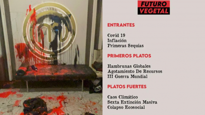 El salón principal del restaurante del programa de televisión MasterChef, situado en la calle Velázquez de Madrid, vivió un día de San Valentín especial. Y no fue por las parejas que celebraban el amor, si no por la irrupción de cuatro activistas del colectivo Futuro Vegetal que vaciaron botes de pintura roja y negra sobre el logotipo del restaurante, el suelo y algunas mesas vacías, todo mientras otros dos activistas grababan la acción. Su mensaje: decir NO a las subvenciones a la industria cárnica.