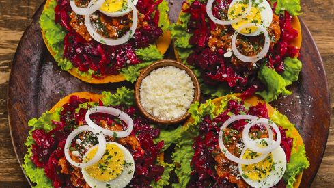 Elaboración: Comienza con una hoja de lechuga, sobre la cual se debe colocar una mezcla de verduras de tu elección, entre las cuales no deben faltar la cebolla y la remolacha. Para los amantes de la carne, este es el momento adecuado para agregar carne de res o pollo cortada en trozos pequeños y (al gusto) un poco de salsa de tomate. Para cerrar la enchilada, se coloca un huevo duro rebanado, una buena pizca de queso duro y cilantro picado.