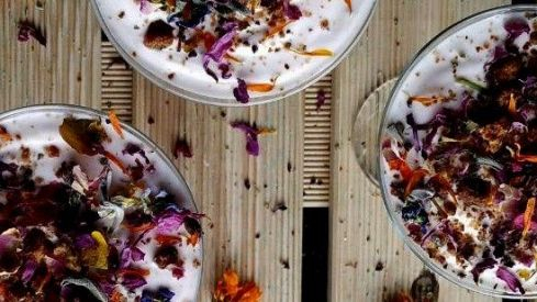 En este caso, y para hacerlo un poquito más divertido, he puesto en pedazos las galletas y he tomado un yogur de cabra de la isla como cama a la que por encima le han llovido pedazos de galletas y los pétalos secos de la flores. Y así, cada cucharada cremosa del yogur se convierte en un juego delicado entre los aromas de los pétalos secos de las flores y las texturas crujientes de las galletas que juegan en la boca.