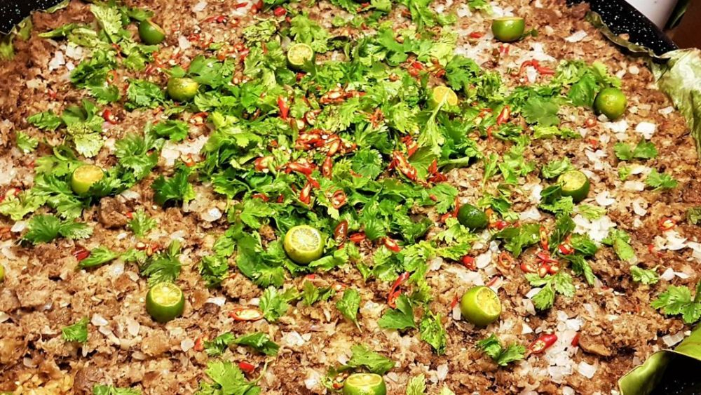 El “sísig” es el plato estrella filipino (la cara entera del cerdo, sesos incluidos, hervida y a la brasa, cortada muy fina con cebolla, chile, kalamansí –el cítrico nacional-…) y el chef Sau del Rosario (restaurantes 25 Seeds y Café Fleur lo juntó con la paella. Es muy distinta a la paella por el arroz, cocción e ingredientes, pero sigue teniendo algo que ver con la valenciana. Es un plato “evolutivo”, según el cocinero. Paella de “sisig”. Todo junto. Arroz japonés, cebolla, caldo de cerdo, el sisig, chile y kalamansí.