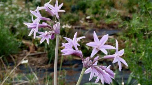 Flor de tulbalgia, a la que vale la pena poner nombre y sabor. La semana pasada hacíamos referencia a las virtudes y sabores de la flor de la cebolla. Vale la pena hacer una breve reseña esta semana a esta flor, tulbaghia violacea, de la familia de las liláceas, con belleza, sabores y virtudes que sorprenden si cabe, aún mas. Planta cuyo crecimiento se da en forma de matojos, tal y como ocurre con plantas como las del cebollino o cebollino chino. En cuanto a sus hojas, esta variedad se diferencia de las otras plantas por la belleza de sus hojas listadas entre blancos y verdes claros. Sus flores son de color violáceo con forma de estrellas dispuestas en grupos florales de forma circular.