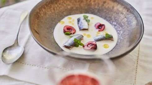 LA RECETA DE VERANO DE MARC FOSHSopa fría de almendras tiernas y aceite de oliva con sardinas marinadas y cerezas.