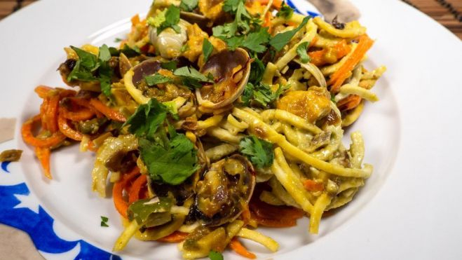 Veguispaguetis de chirivía con pollo, almejas y crema de aguacate