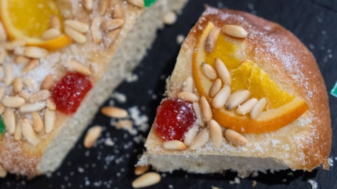La Mejor Coca de Sant Joan tradicional de fruta confitada y piñones se elabora en la pastelería Pachi Larrea. Se ha valorado la pasta (color, sabor, esponjosidad, masticabilidad), el aspecto exterior (distribución de frutas, piñones y azúcar, color), la cocción interior y la cocción exterior // Dirección: Passatge Mercè Rodoreda, 2, 08860, Castelldefels (Barcelona).