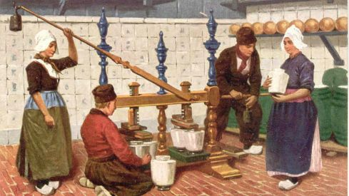 Retirado el suero y después de pasar por el agua para el lavado, se llenan los moldes, con forma circular o de paralelepípido, para pasar a prensarse, interviniendo la herramienta holandesa ya mencionada. Cuanto más se prensa la masa cuajada, más se exprime el suero contenido en esta, es decir, más se reduce la cantidad de líquido que contiene, compactándose la pasta dentro del molde.